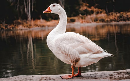 White goose standing on the bank of the lake in the autumn.