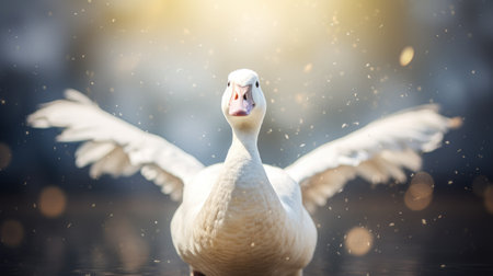 A beautiful goose spreads its wings gracefully in the early morning mist, creating a serene and tranquil scene. This captivating image captures the essence of wildlife in nature.