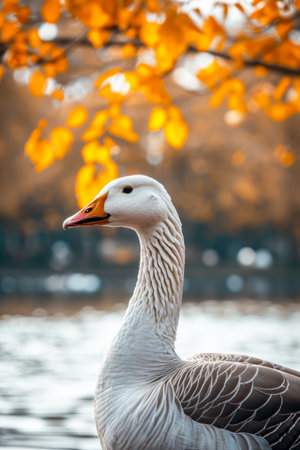 A stunning image of a goose gracefully swimming on a still lake, surrounded by vibrant autumn foliage. The peaceful scene captures the beauty of nature.