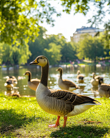 A goose stands proudly on the green grass by a tranquil lake, surrounded by ducks, with sunlight filtering through the trees, creating a peaceful atmosphere in the park.