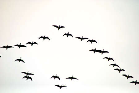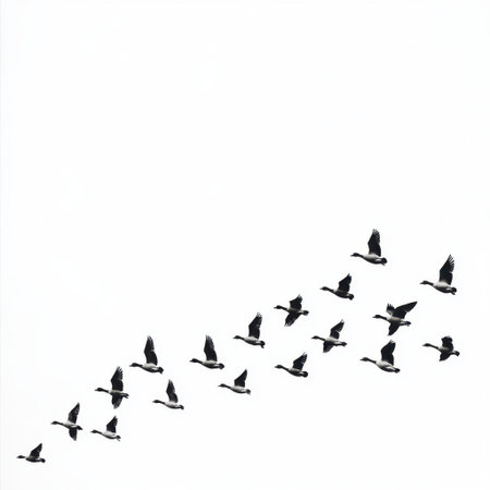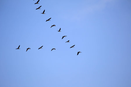 Many birds flying in clear v shaped formation on bright white background migration flock silhouette concept for nature border poster and seasonal travel design