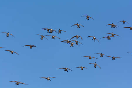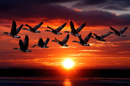 Migrating flock of Canadian geese flying in evening sunlight. Seasonal bird migration.