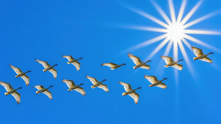 A beautiful minimalist image of a flock of birds flying in a graceful formation against a bright and clear sky, symbolizing freedom and natural beauty.