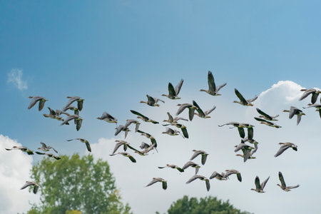 A flock of geese flying on the spring sky. Greater white-fronted goose (Anser albifrons) and Taiga bean goose (Anser fabalis).