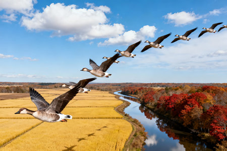 flock of geese flying in V-formation over autumn landscape --chaos 30 --ar 16:9 --v 6.1 Job ID: 09968531-3ef6-4b31-9d75-4f37f1057393