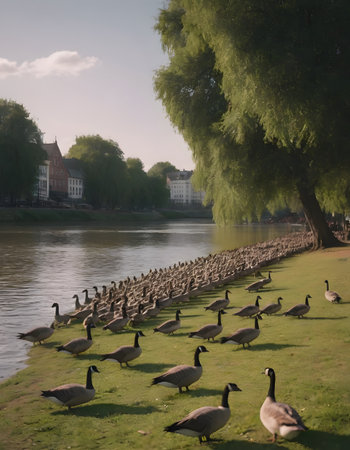 Canada geese parade across a vibrant green field, illuminated by the soft glow of early morning sunlight, creating a serene and picturesque scene of wildlife in their natural habitat