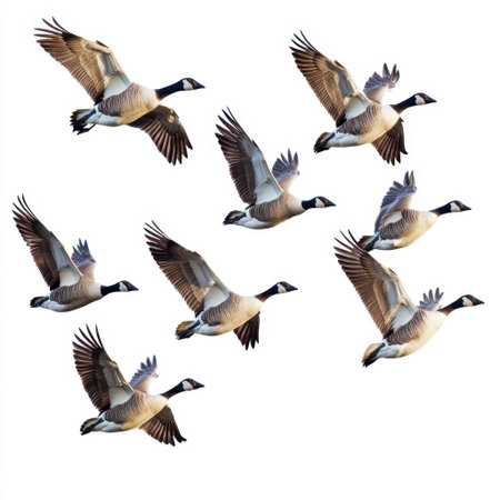 A stunning image of Canada geese in a graceful flight pattern, showcasing their beauty against a minimalist white backdrop, perfect for nature-themed projects.