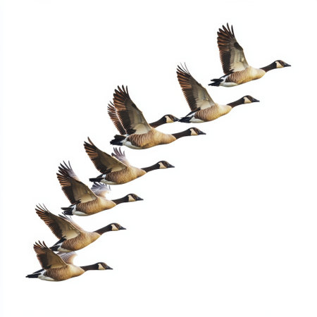 A captivating sequence of geese in mid-flight, illustrating their elegant movement against a stark white backdrop. This image captures the essence of wildlife in harmony with nature.