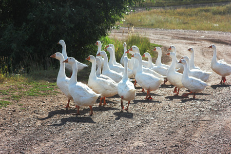 Beautiful domestic geese walking in a meadow near a farmhouse. Farm animals