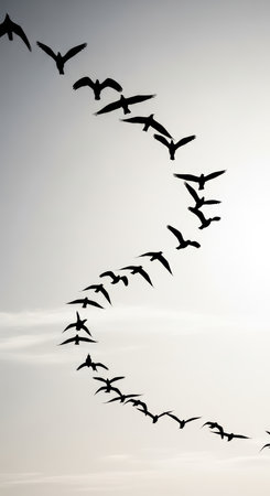 Group of birds flying elegantly against a backdrop of clouds, capturing the essence of freedom and nature's beauty in a tranquil setting