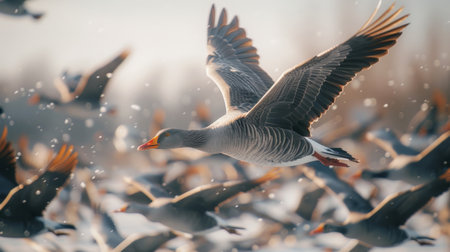 A vibrant flock of geese flying together in a snowy sky, showcasing dynamic motion and winter scenery.