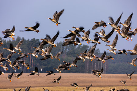 A large flock of wild geese in flight over forested landscape in Biebrza, Poland. Nature and wildlife in motion.