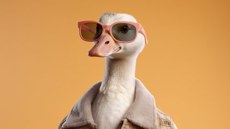 a fashionable goose confidently sporting a pair of trendy sunglasses. The goose stands out against a delightful pastel background, creating a whimsical and captivating scene.