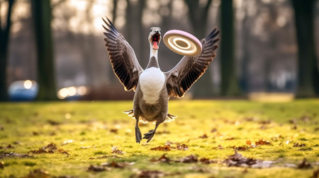 A stunning goose spreads its wings gracefully on a peaceful nature pathway, surrounded by lush greenery and soft light, capturing the essence of wildlife in motion.