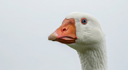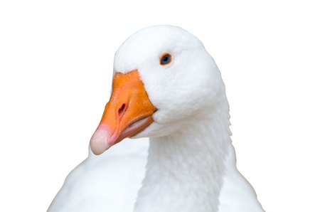 Close up of a white goose looking at the camera on a white background
