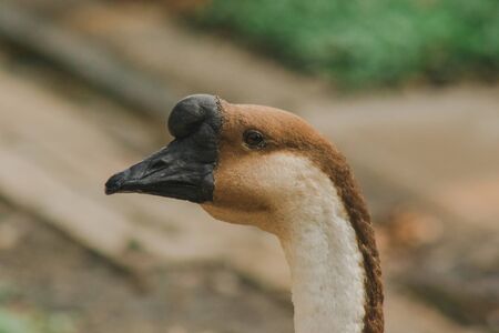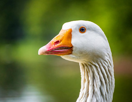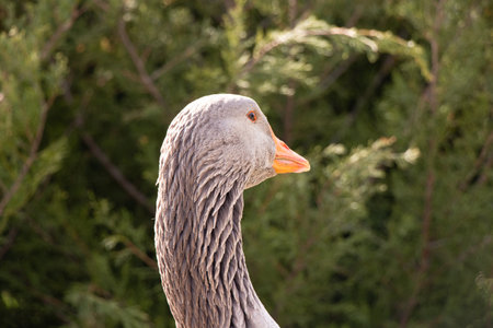 Domestic goose, Anser cygnoides domesticus, in profile. Domesticated grey goose, greylag goose or white goose portrait on green blured background