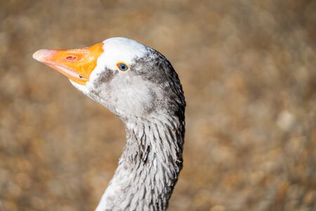 Close up of the head of a domestic geese, domesticated grey geese that are kept by humans as poultry for their meat, eggs, and down feathers since ancient times