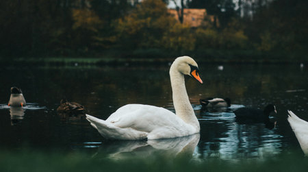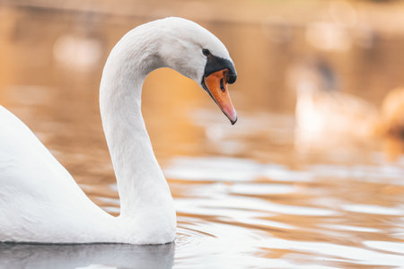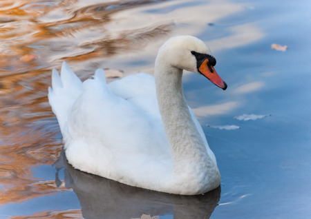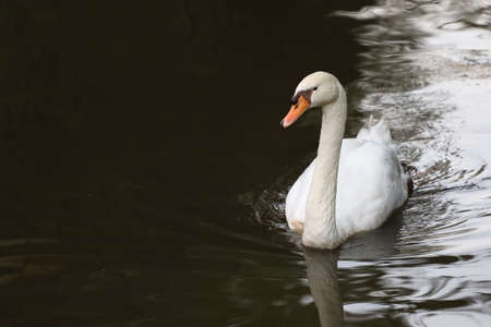 Graceful white Swan swimming in the lake, swans in the wild. Portrait of a white swan swimming on a lake. The mute swan, latin name Cygnus olor.