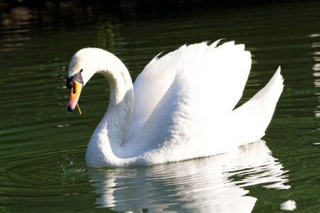 Portrait of a graceful white swan with long neck on dark green water background. The mute swan, Cygnus olor