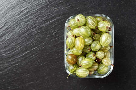 Ripe gooseberries scattered on a black slate background, space for text