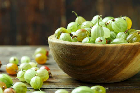 Fresh gooseberry in a wooden bowl. Small depth of field.