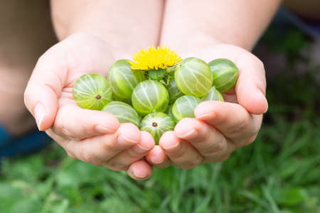 the girl holds a handful of ripe green gooseberries in her hands