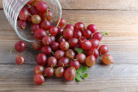 Red gooseberries sprinkled from a glass on a wooden table