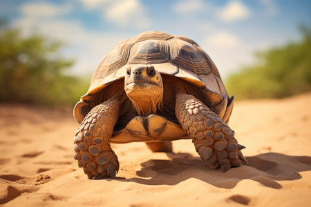 turtle goes slowly in the sand with its protective shell