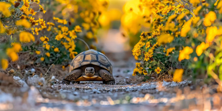 A closeup shot of a big turtle among beautiful Chamomile flowers in the field on a sunny day