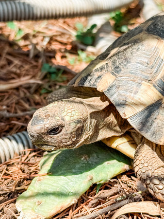 African spurred tortoise is eating a plant, close up, macro.