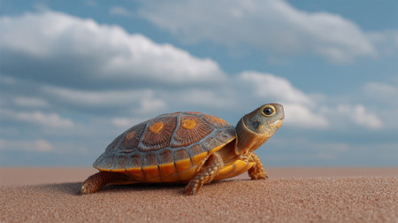 A colorful turtle moves across a sandy landscape under a bright blue sky with fluffy clouds, highlighting its unique shell patterns in a serene outdoor environment.