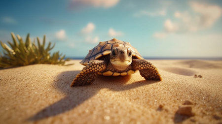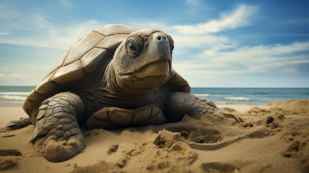a turtle gracefully strolls along the sandy beach under a vibrant blue sky. this captivating photo showcases the beauty of nature with its sepia tone effect. the image is enhanced with vray tracing, resulting in a realistic portrayal of the turtle's lifelike features. the colorization adds depth and richness to the scene, while the turtle's strong facial expression adds a touch of intrigue. this stunning