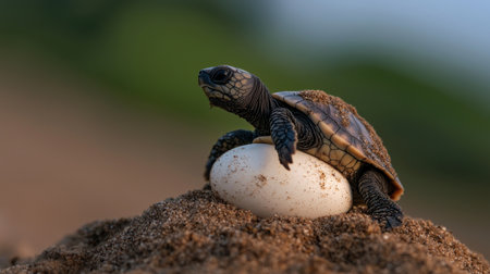 A baby turtle is laying on top of an egg. Concept of new life and growth, as the turtle is about to hatch from its shell. The scene is peaceful and serene, with the turtle