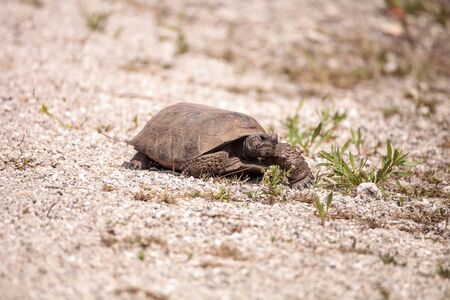Florida Gopher Tortoise Gopherus polyphemus forages for food in the grass on Bonita Springs, Florida