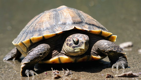 A close-up view of a peaceful turtle resting on the ground under the warm rays of the sun