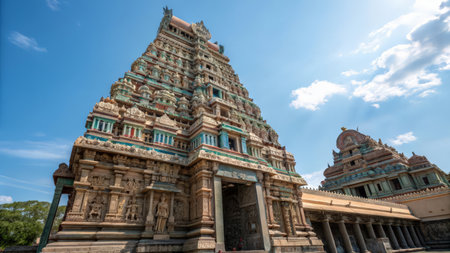 This image showcases the vibrant architecture of a Hindu temple, adorned with intricate colors and designs, set against a bright sky, reflecting cultural heritage and spirituality.