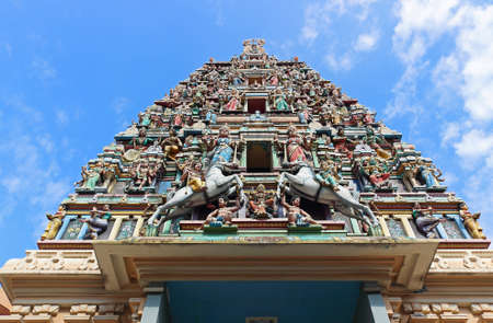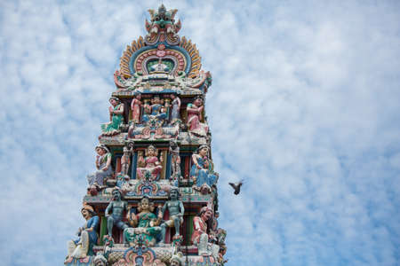 Fragment of Sri Maha Mariamman Temple entrance roof decorated with colorful statues of hindu gods. Oldest Hindu temple in Kuala Lumpur, Malaysia.