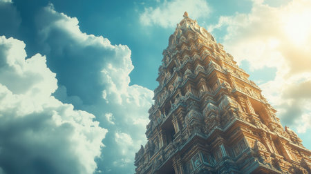 This stunning image captures the grandeur of a temple tower, emphasizing intricate architectural details against a vibrant blue sky, perfect for cultural or travel themes.
