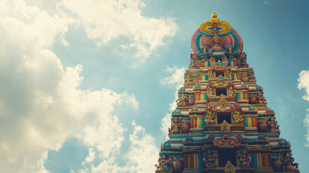 Hindu temple gopuram (tower) with space for text in the sky. Architectural marvel.