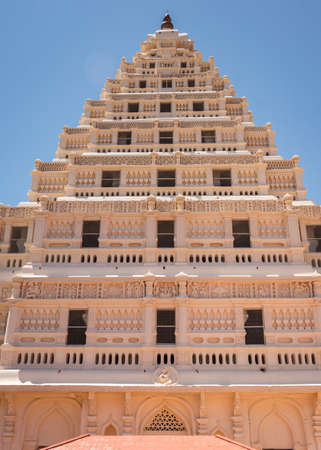 Thanjavur, India - October 14, 2013: The front of the beige Arsenal Tower at Thanjavur Palace against a blue sky. Focus on one facade of this pyramid. Lakshmi and other decorations worked in frescos.