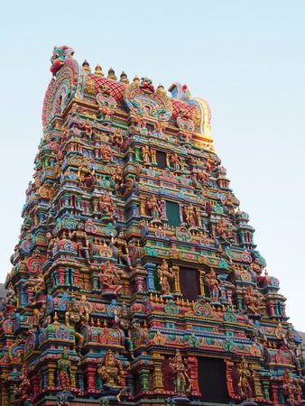 The colorful gopuram tower of the Shiva Temple, decorated with colorful sculptures of Gods and sacred animals, Galle, Sri Lanka.