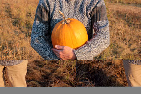 A person holding big orange pumpkin on hay field background. Female hands in gray sweater with huge pumpking. Top view, Copy space, selective focus