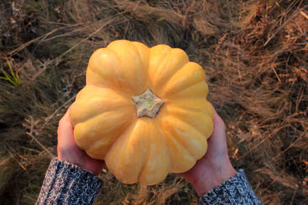 Top view of decorative pumpkin in hands on dry grass background. Selective focus