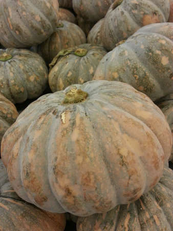 Fresh large healthy bio pumpkins on farmer agricultural market at autumn. Healthy food.