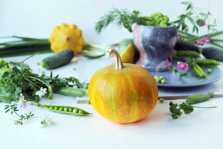Fresh seasonal organic vegetables and herbs for cooking vegetarian lunch, healthy food concept