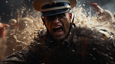 Close-up of a determined rescue medic with muddy face during an emergency operation in a forest.