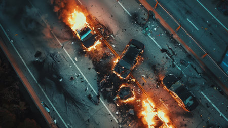 Top view Highway car accident with Flames bad multi-vehicle accident AI generated