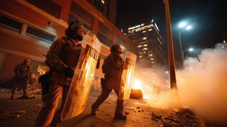 In a tense urban atmosphere, police in riot gear advance through thick smoke while facing an uproar during nighttime protests marked by visible flames and chaos.