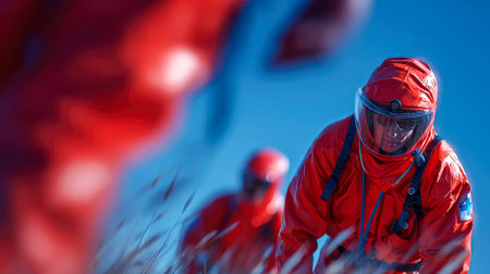An AI-generated illustration of a group of police officers wearing protective respirator masks gathered in front of a large explosion.