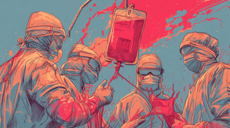 A captivating illustration of four surgeons in scrubs focused on a critical blood transfusion, showcasing the intensity and teamwork in a medical setting.